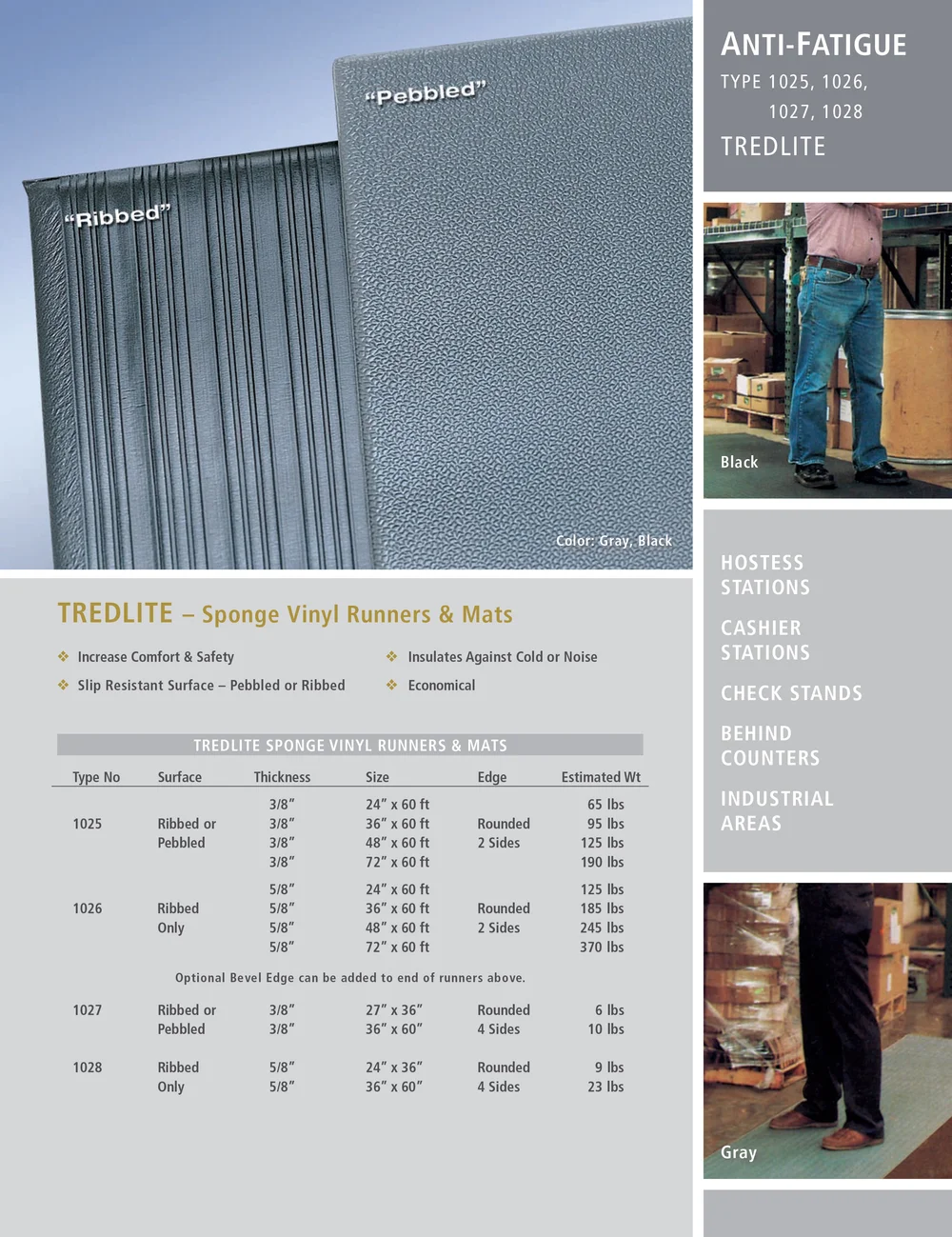 1025, 1026, 1027, 1028, anti fatigue, anti-fatigue, tredlite, sponge vinyl runners, comfort, safety, ribbed, pebbled, hostess stations, cashier stations, check stands, behind counters, industrial areas, 3/8 inch, 5/8 inch, insulation.